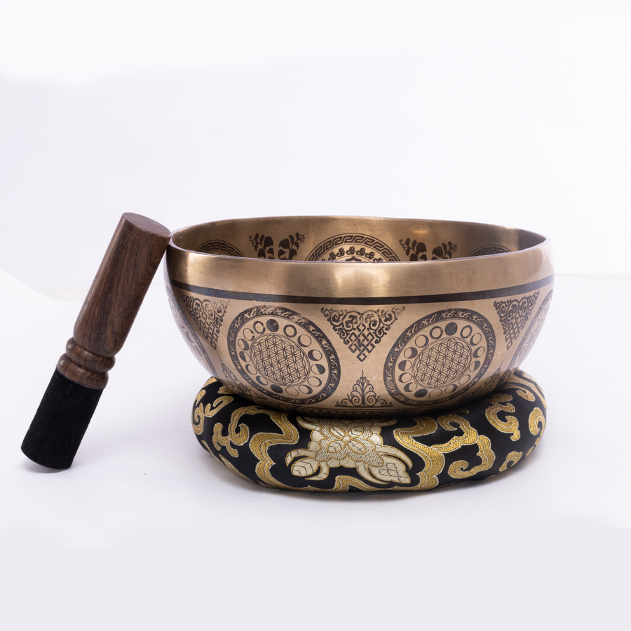 This singing bowl, adorned with the engraving of Shweta Mahakala, channels the potent energies of this revered Tibetan protector deity. Shweta Mahakala, known for his white appearance symbolizing purity and compassion, serves as a guardian against negative forces and a guide towards enlightenment. His presence on the bowl is not merely decorative but deeply symbolic, infusing each sound wave with protective energies. Crafted from a blend of seven sacred metals, the bowl's resonant tones are ideal for meditation, yoga, and spiritual practices, aiding in the cultivation of inner peace and mindfulness. Embracing the power of Shweta Mahakala through this singing bowl offers a unique opportunity to connect with ancient wisdom and protective strength, making it a profound addition to any spiritual journey.